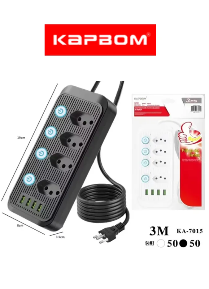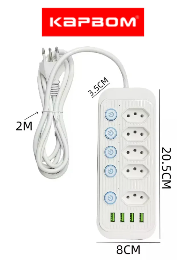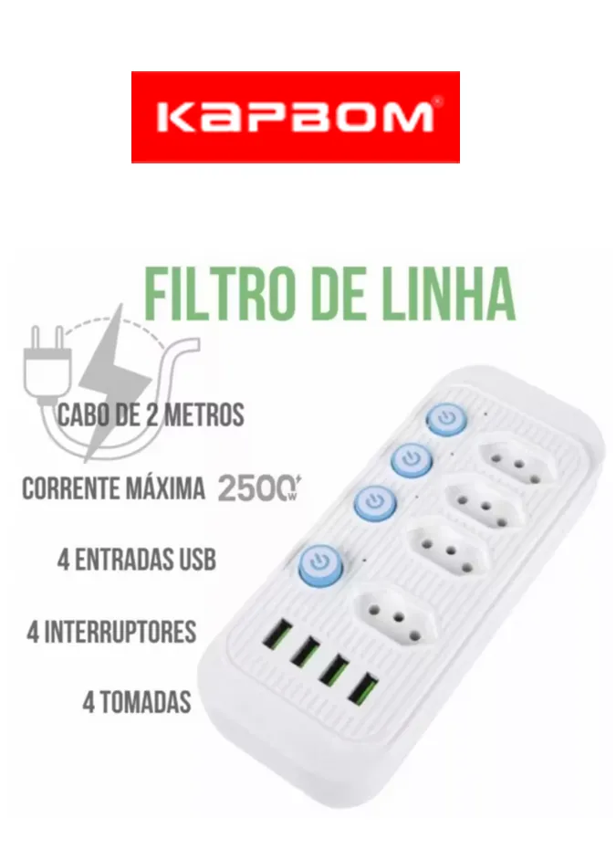 Extensão 4 Tomadas 4 USB Universal Bivolt 110v/250v 2500W Power 2m Filtro De Linha Segurança