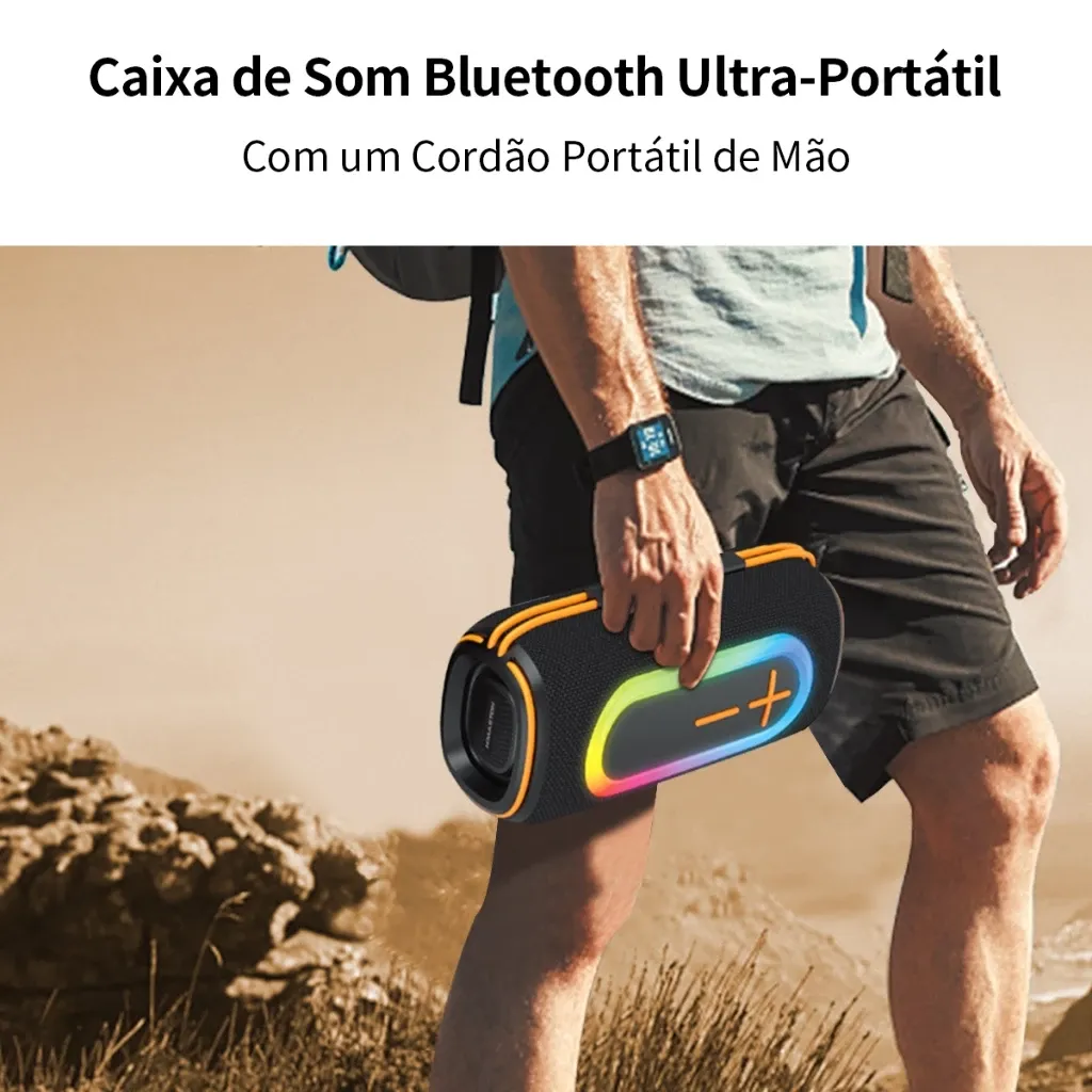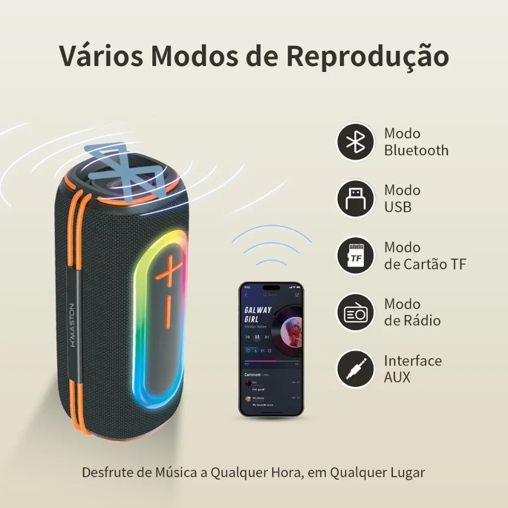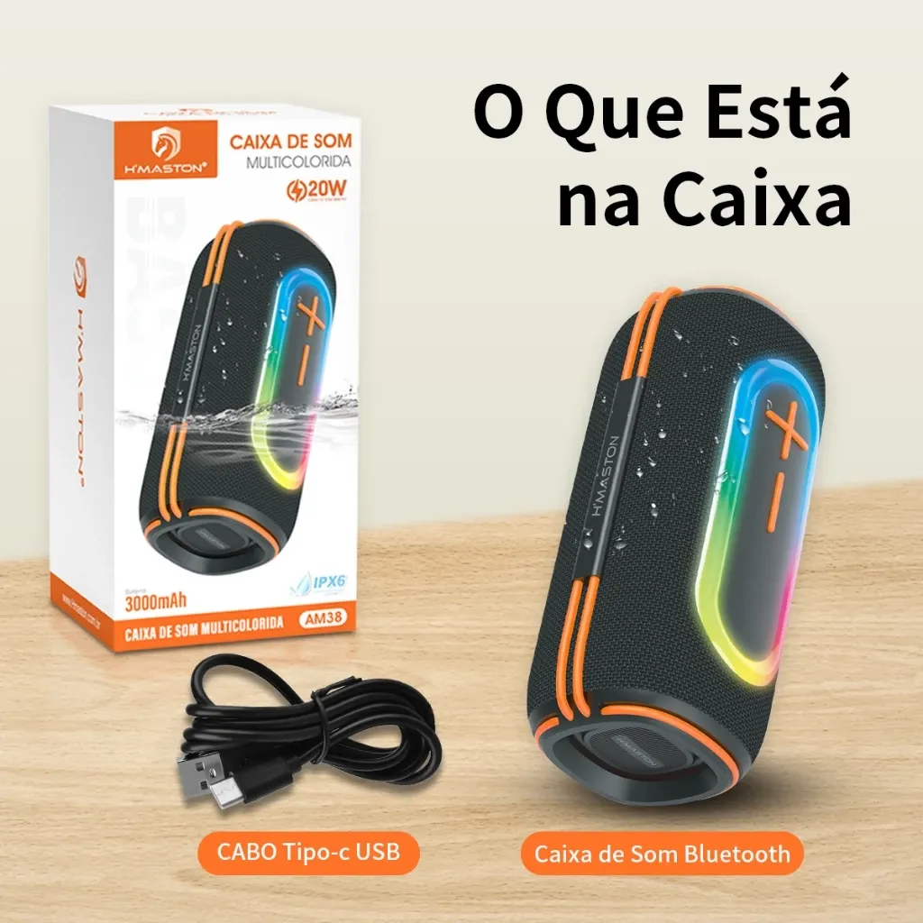 Caixa de som Bluetooth H'maston AM-38 É portátil e possui excelente qualidade de som, o que o torna ideal para uso em casa e durante viagens, passeios e muito mais.