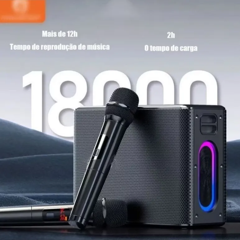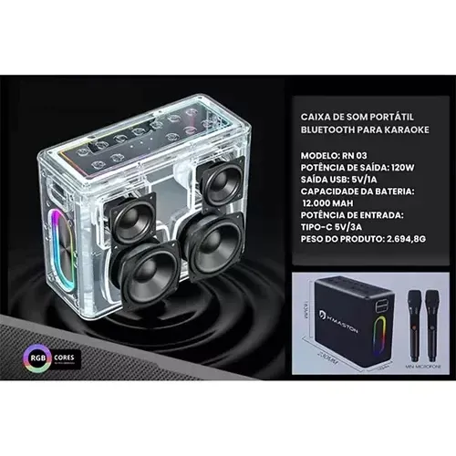 Caixa de Som Bluetooth Karaokê RN03 com 2 Microfones Caixa De Som Grave Qualidade Premium VVV