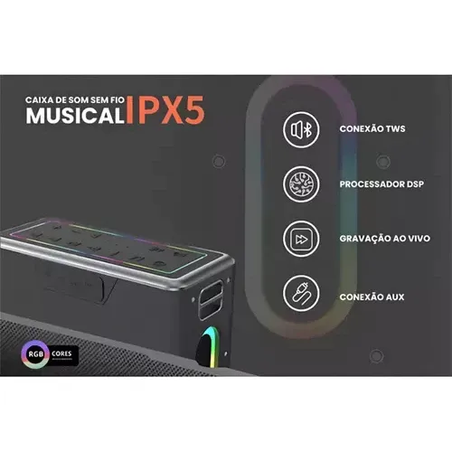 Funções: Karaokê, Rádio FM, Reprodução de música via Bluetooth, USB ou cartão de memória
