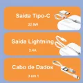 - Cabo de carregamento removível: Vem com um cabo de dados removível, saída USB, suporta carregamento Tipo-C e Lightning, suporta carregamento rápido Tipo-C de 22.5W,Apple 2.4A;pode carregar 2 dispositivos ao mesmo tempo.