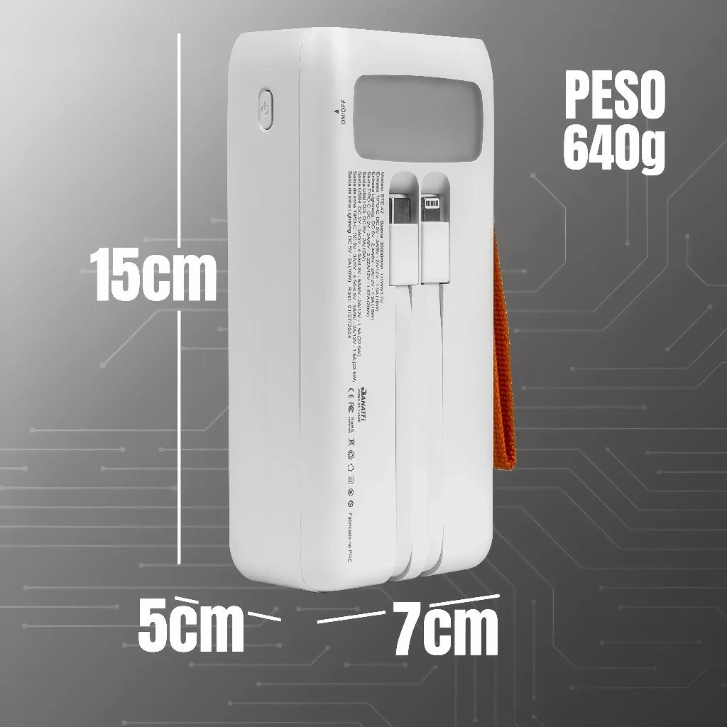 Capacidade Imensa: Bateria de 30.000mAh para carregar seus dispositivos múltiplas vezes.