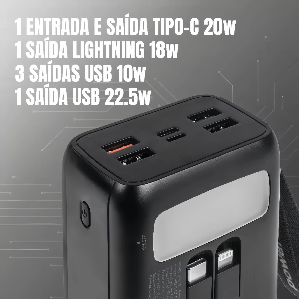 Este power bank é mais do que uma simples bateria portátil; é uma fonte de energia robusta e inteligente que atende a todas as suas necessidades de carregamento. Com capacidade generosa e múltiplas opções de entrada e saída, ele garante que seus dispositivos permaneçam sempre carregados e prontos para uso.