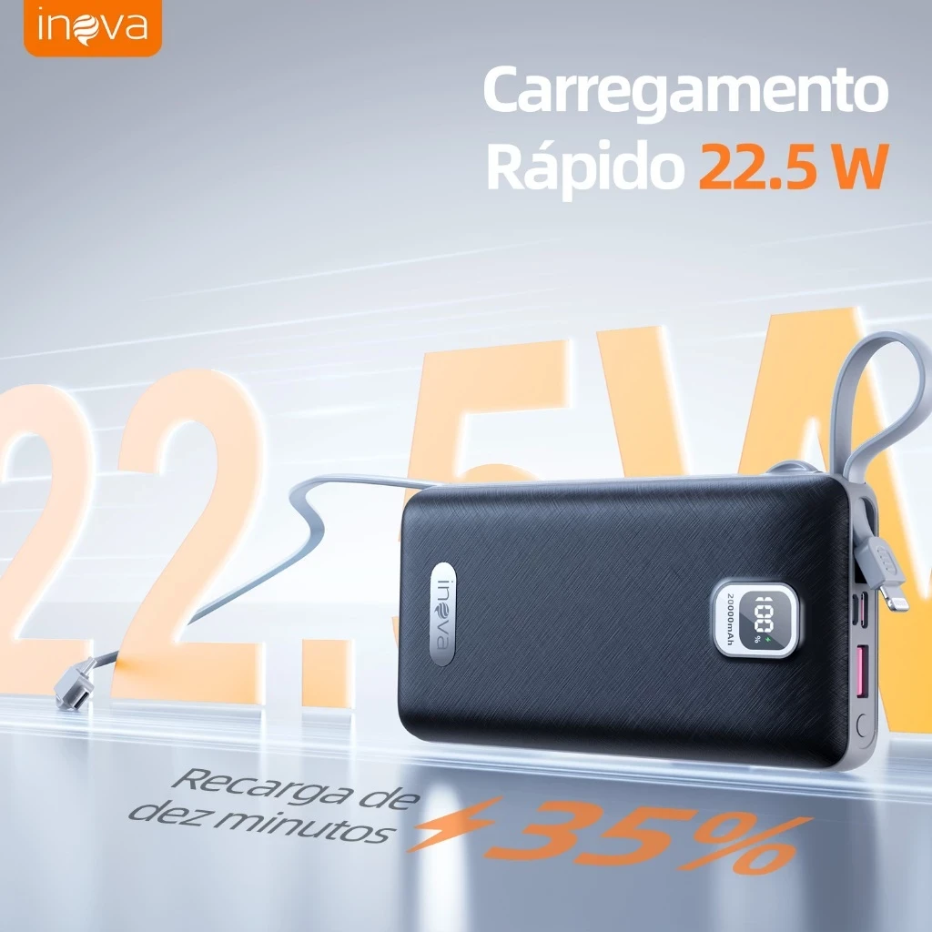 Bateria Externa 20000mAh 22.5W — Energia duradoura e recarga rápida.