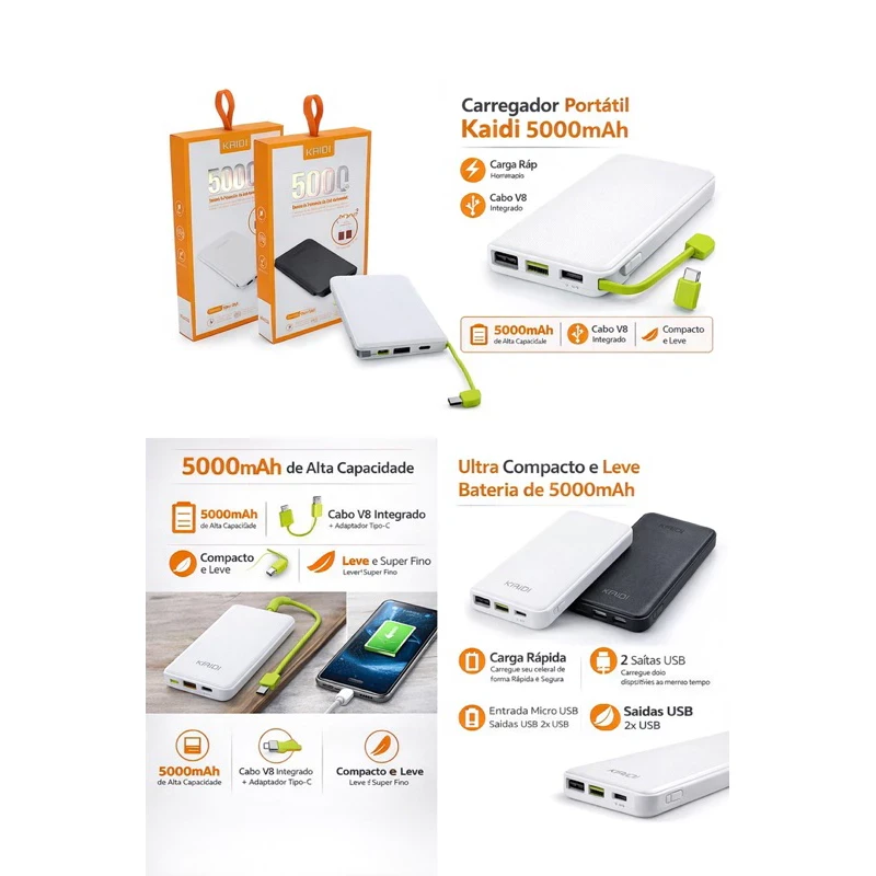 Power Bank Kaidi 5000mAh com cabo integrado, ideal para recarregar seus dispositivos em qualquer lugar. Duas saídas USB permitem carregar dois aparelhos simultaneamente. Entrada Micro USB para recarga rápida. Design compacto e leve, cabe no bolso. Cabo V8 integrado evita fios perdidos. Perfeito para viagens, trabalho e uso diário, com confiança e praticidade.