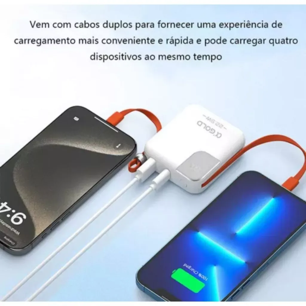 Alta Capacidade: Com 10.000mAh, permite carregar seu dispositivo diversas vezes sem preocupação.