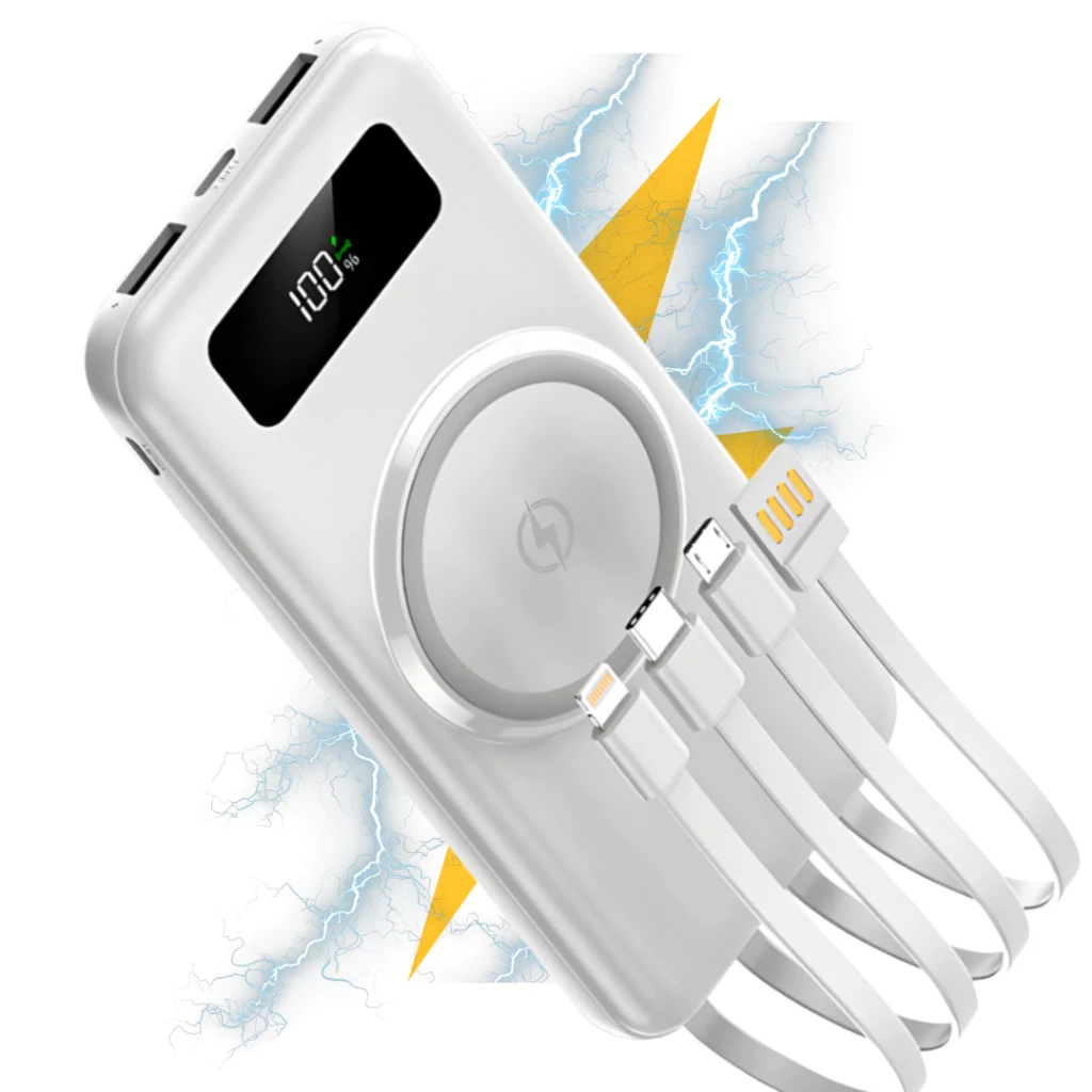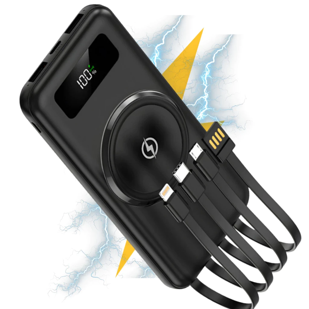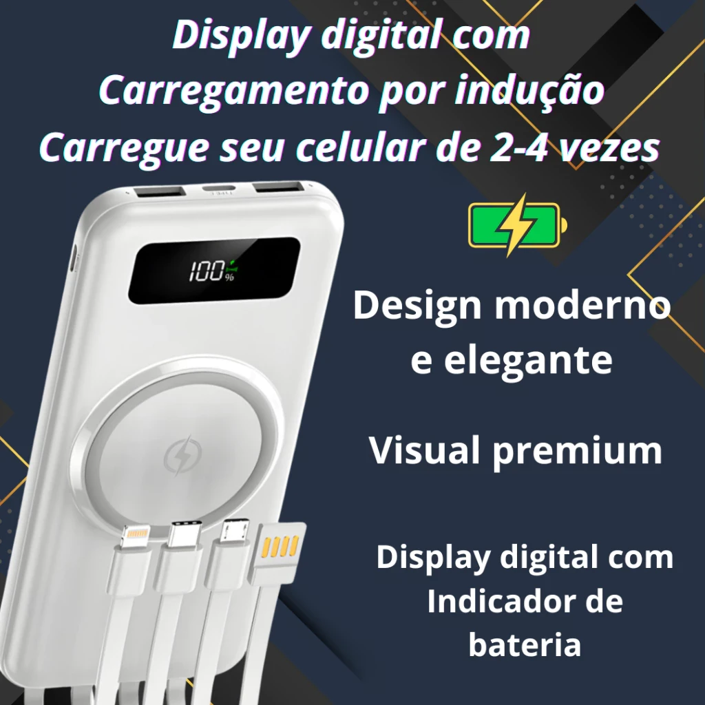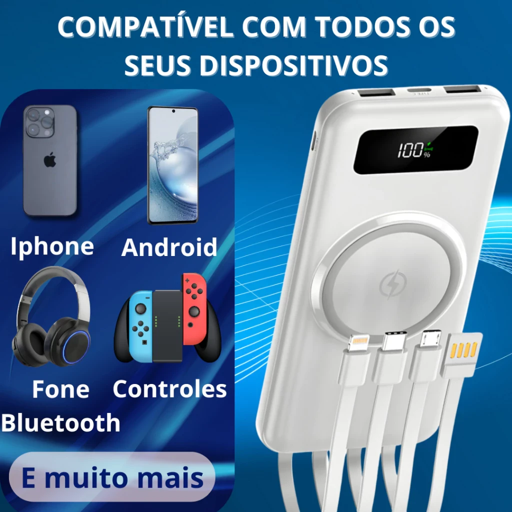 Conta com cabos integrados, oferecendo praticidade para carregar diferentes dispositivos sem a necessidade de cabos adicionais.