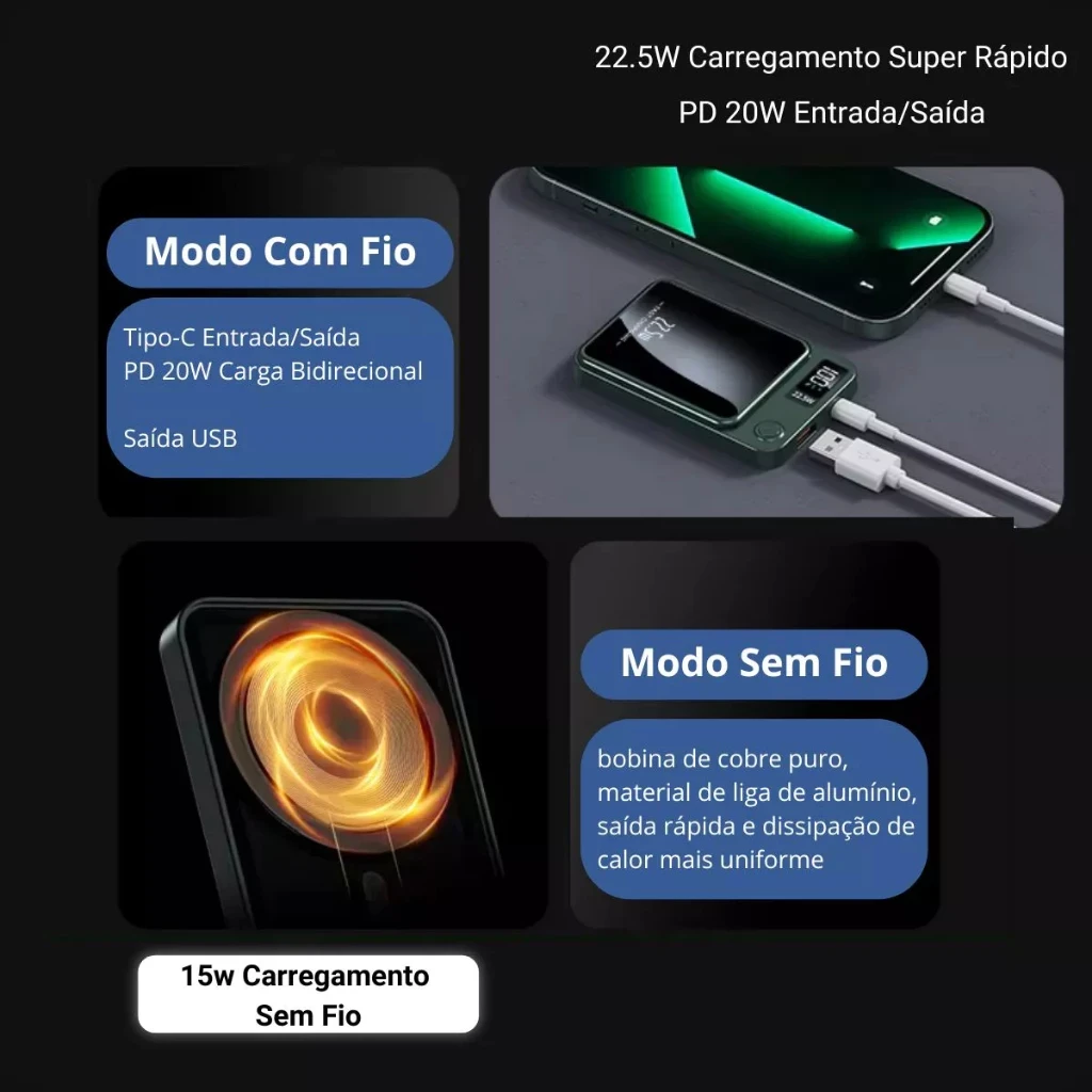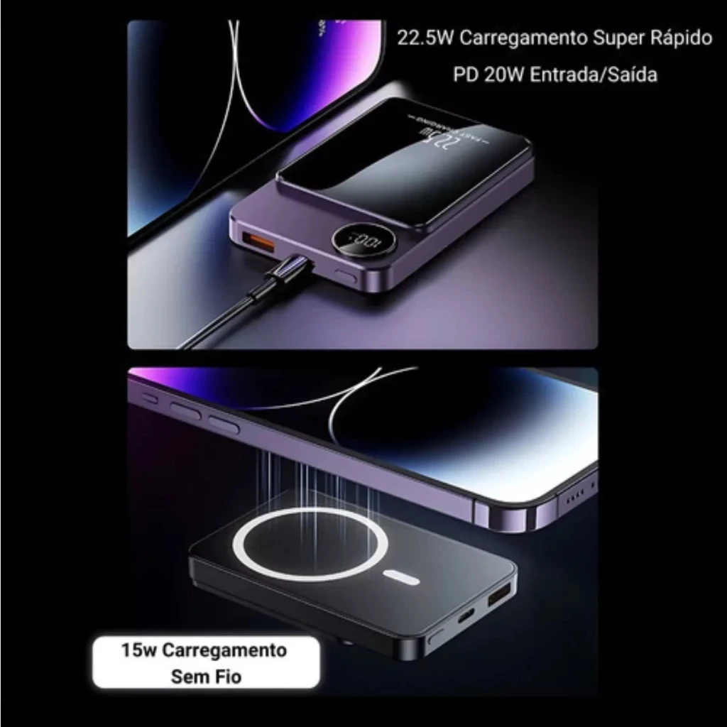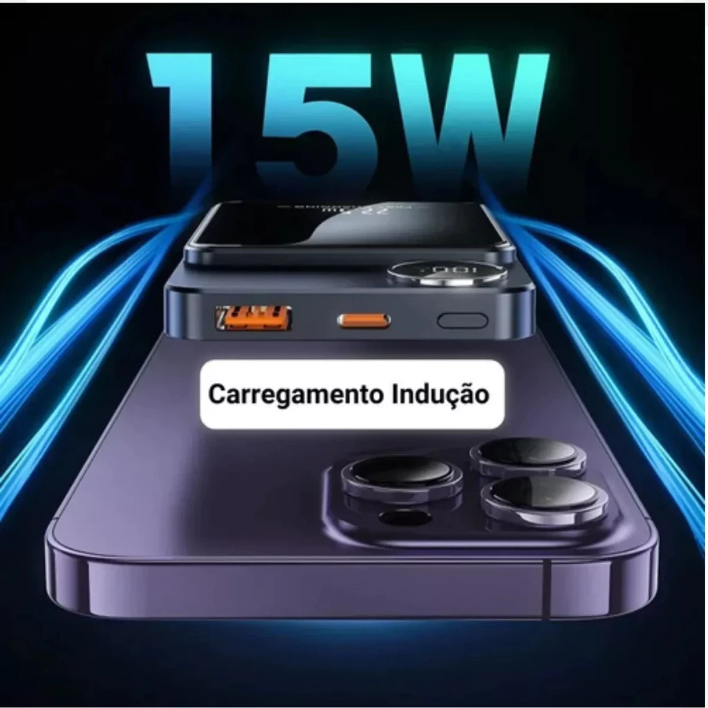 - Carregamento Magnético: Adeus aos cabos desajeitados! Conecte seus dispositivos magnetizando-os instantaneamente ao Power Bank.