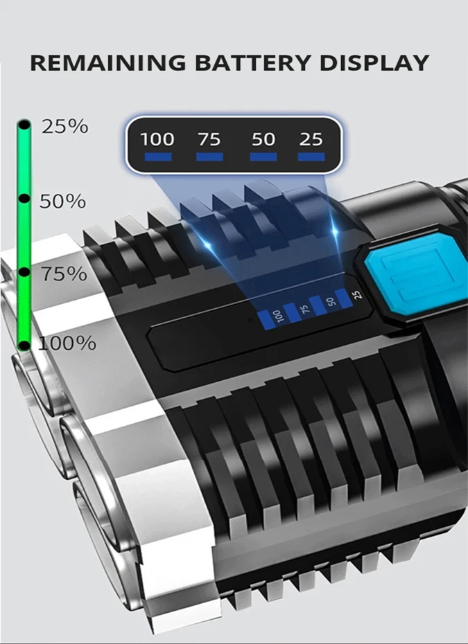 Monitoramento de Bateria em Tempo Real: Um LED indicador exibe a porcentagem da bateria restante, garantindo que você nunca fique no escuro inesperadamente.