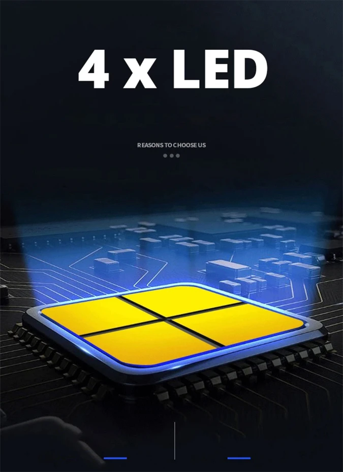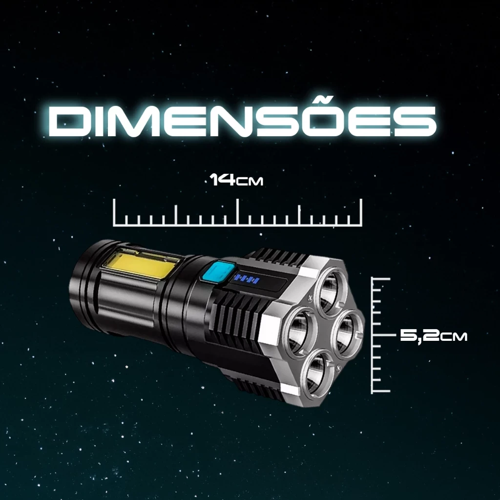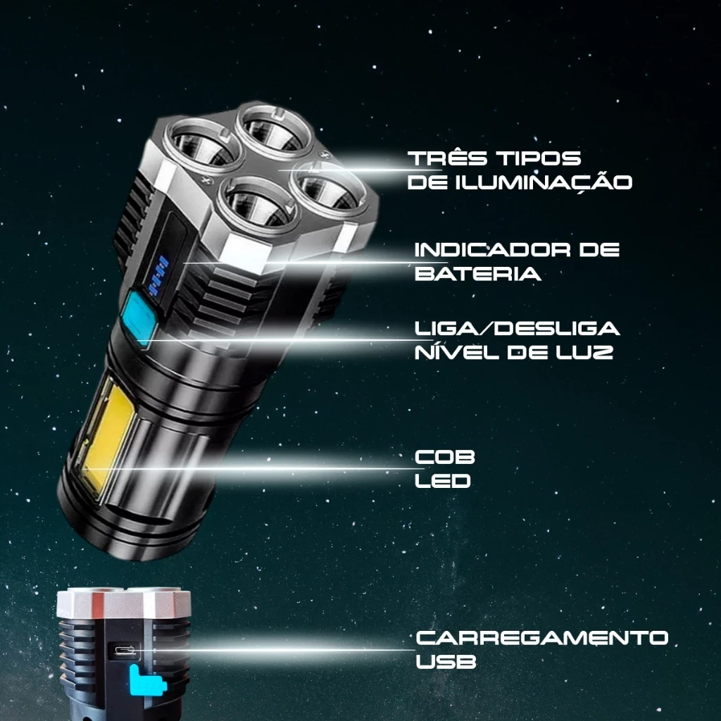 Potência Imbatível: Com 4 ULTRA LEDs de 800 Lumens, a L-19 oferece uma intensidade de luz iluminando até os cantos mais escuros.