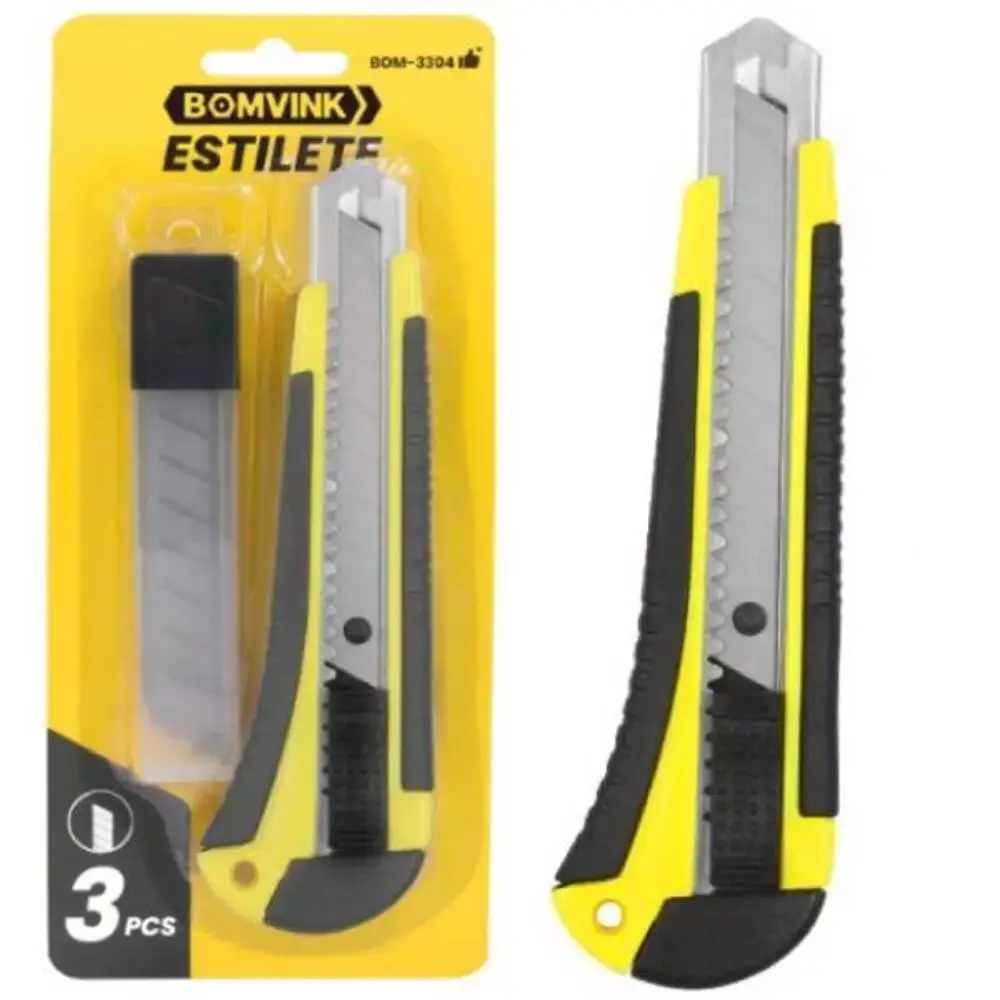 O Estilete Largo 18 mm com 3 Lâminas - BOM-3304 da Bomvink é ideal para profissionais e entusiastas do faça-você-mesmo, este estilete combina robustez com um design ergonômico para proporcionar cortes mais precisos e menos esforço físico. Se o seu trabalho ou hobby exige cortes impecáveis, este estilete é a escolha perfeita!