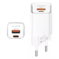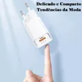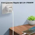 Carregador de parede USB 30W com duas portas: USB-C PD e USB-A QC4.0, para recarga rápida de smartphones, tablets e acessórios. Compacto, bivolt 100–240V, ideal para casa, escritório ou viagens. Proteções contra sobretensão e sobrecorrente asseguram segurança para seus dispositivos. Design moderno em branco que combina com qualquer tomada.