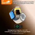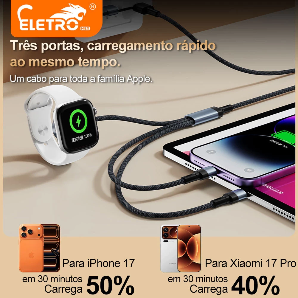 Carregamento em casa: Ao lado do sofá ou da mesa de cabeceira, um único cabo carrega simultaneamente seu telefone, fones de ouvido e relógio.